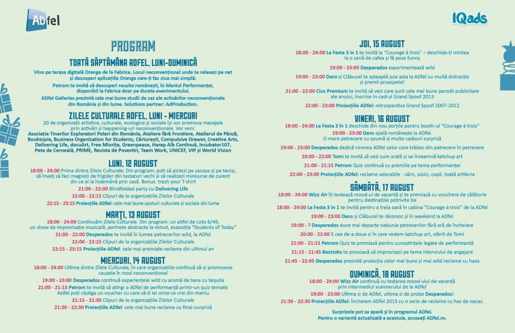 În cei 7 ani de ADfel, au fost prezente peste 100 de branduri și implementate mai mult de 350 de idei neconvenționale. Vă mai semnalăm și o nouă ediție a parodiilor de reclame – Grand Spoof – și o colecție cu cele mai premiate lucrări neconvenționale din întreaga lume – ADfel Galleries. Redacția IQads pregătește și anul acesta Suplimentul ADfel, „un ghid de ilustrare a evenimentului de branded entertainment și a fenomenului neconvenționalului în România și în lume, distribuit împreună cu 24FUN”. Anul trecut a scris și Motanov vreo două vorbe.