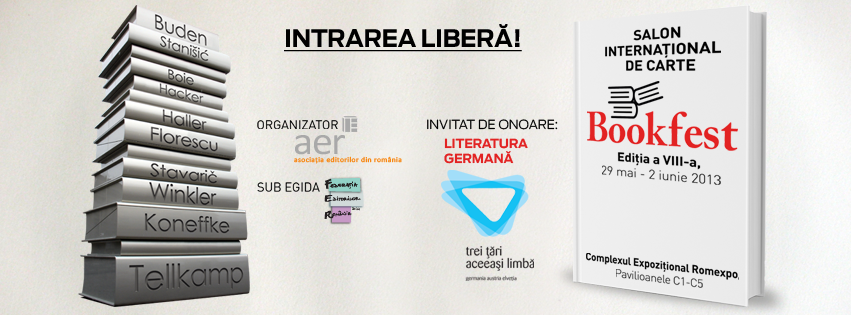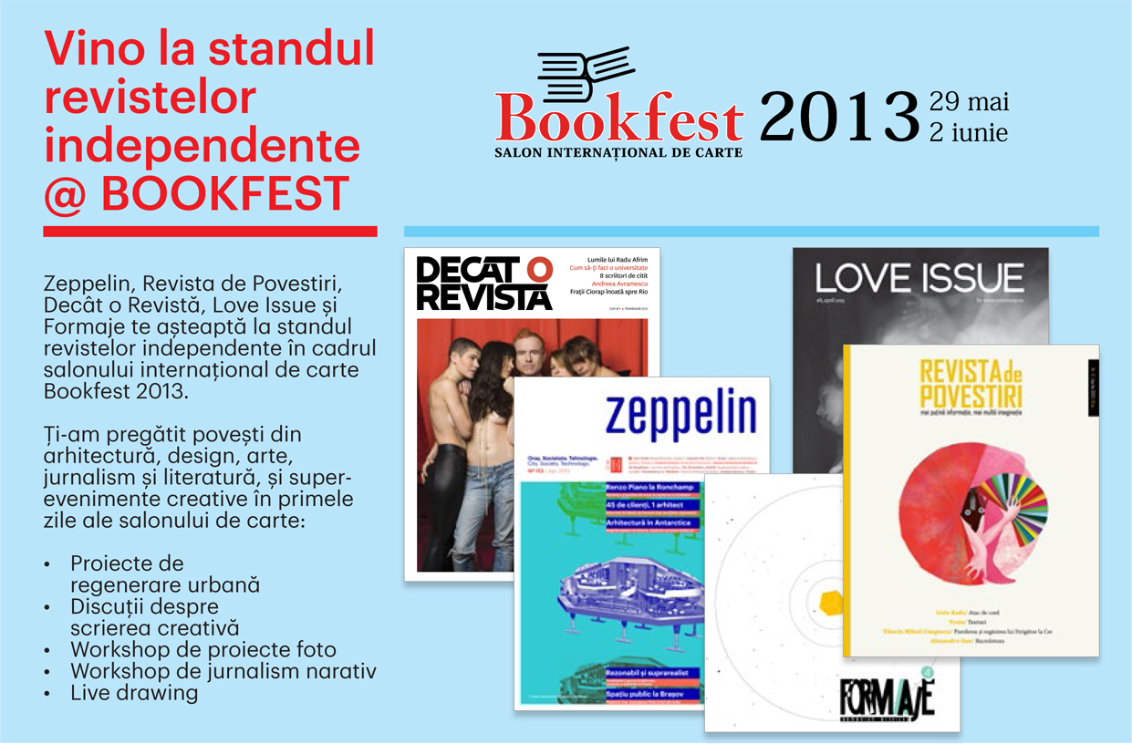• […] Vă povesteam săptămâna trecută despre Bookfest 2013 și despre planul creativ de acțiune al revistelor independente. Vă reamintim că Salonul Internațional de Carte are loc de miercuri până duminică, în pavilioanele C1-C5, la Romexpo. Între timp a fost publicat și programul complet al evenimentelor. […]