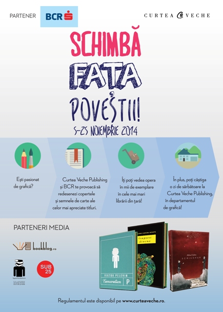 „Curtea Veche Publishing și BCR lansează concursul național de grafică „Schimbă fața poveștii!”, adresat tinerilor talentați, pasionați în egală măsură de grafică și de povești spectaculoase. Concursul, organizat cu scopul de a pune în valoare creativitatea tinerilor și de a le oferi șansa afirmării, propune recrearea într-o variantă personală a copertelor și semnelor de carte pentru trei titluri cunoscute din colecția Byblos, pe care Curtea Veche Publishing o dedică literaturii contemporane internaționale.