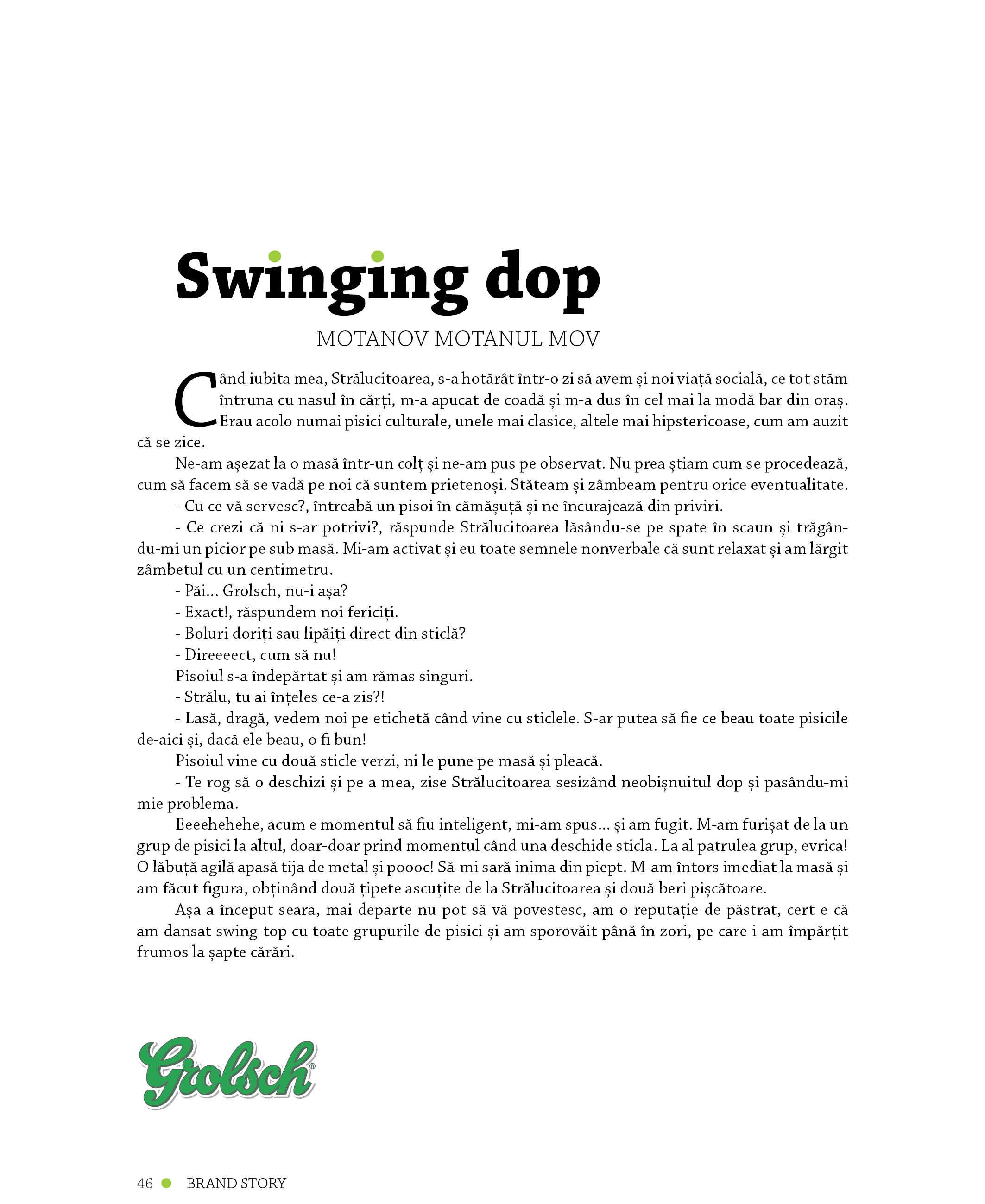 Iată despre ce e vorba. Așa cum cititorii revistei știu, avem acolo o secțiune care se numește Brand Story, unde publicăm o povestire legată de un brand. Intenția e ca ea să aibă valoare literară – să fie bine scrisă, să trezească emoție. Nu e un advertorial, nu e istoria brandului, e o povestire așa cum sunt și celelalte din revistă. Doar că într-un fel sau altul are o legătură cu un brand.