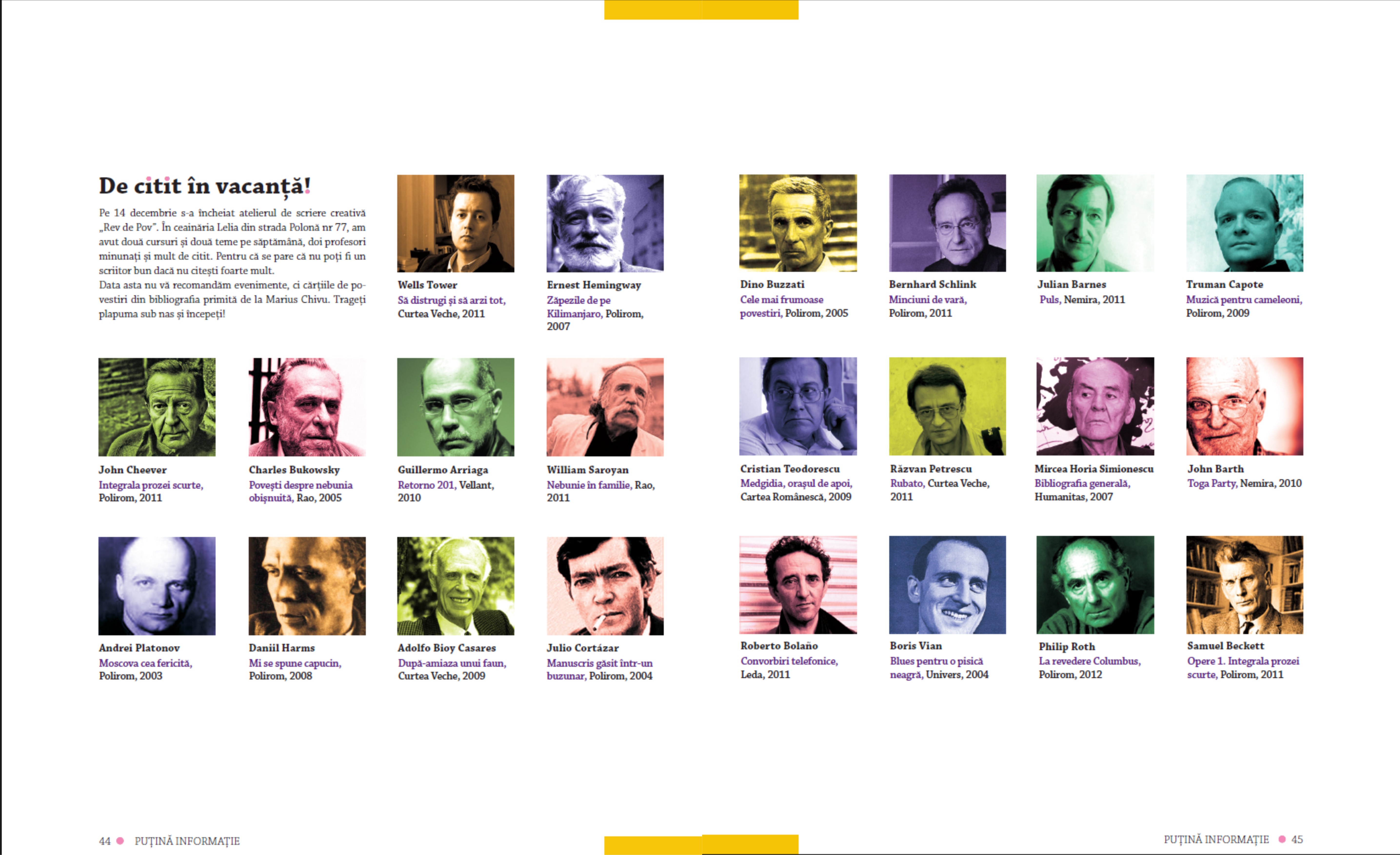 Am anunțat pe 10 ianuarie concursul de povestiri care se va solda cu publicarea celor mai bune texte în ultimul număr al revistei, programat pentru aprilie. Prima etapă s-a încheiat pe 10 februarie, dintre cele aproape 90 de povestiri primite până atunci, am ales 16 pentru publicare și un câștigător al unui loc la atelierul de scriere creativă coordonat de Florin Iaru și Marius Chivu, la care între timp au și început înscrierile.