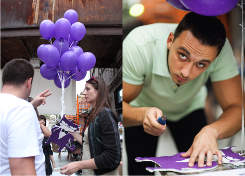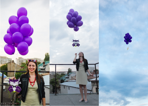 De la 5 la 6 jumate am stabilit zonele de activități și nu mult după, am început evenimentul cu intenția să-l lansăm pe Motanov în spațiu. L-am legat de cele 17 baloane (cu un mesaj pentru extratereștri scris pe un post-it de un participant jucăuș) și la o probă, ce să vezi, se ducea în jos, în loc să se ridice. Ce să facem, ce să facem: l-am tăiat! Am renunțat la picioare și a mers (!). Ne-am urcat pe acoperiș și i-am dat drumul în spațiu… Cine știe unde o fi aterizat și pe unde plouă astăzi mov!