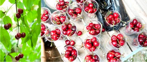 I-am întâmpinat pe prietenii noștri cu cireșe atârnate în copacii din jurul mesei cu reviste și cu cireșe pe mese. Vera le-a ales pe cele mai frumoase. Au fost bune și de cercei.