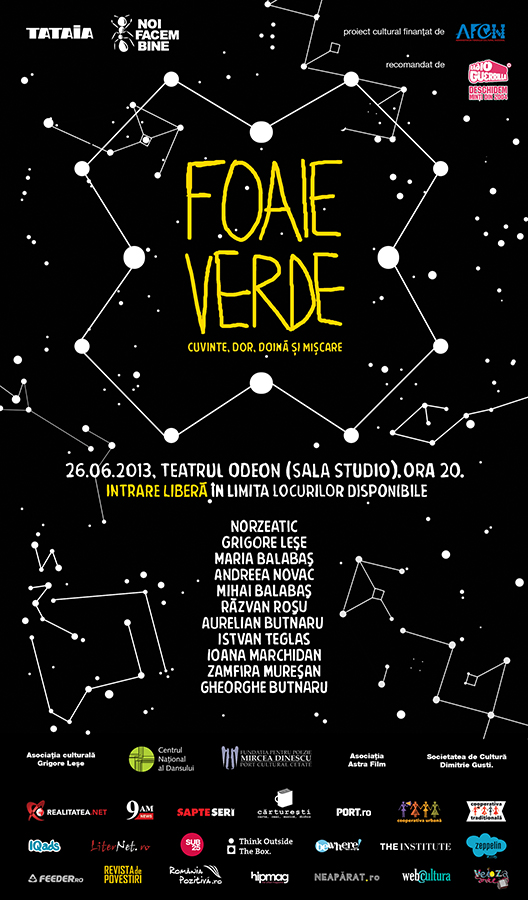 Miercuri, 26 iunie, de la 20.00, la Sala Studio a Teatrului Odeon, TATAIA şi Asociaţia Noi Facem Bine vă invită (și noi odată cu ei) la „Foaie verde”, un performance multimedia live și irepetabil.