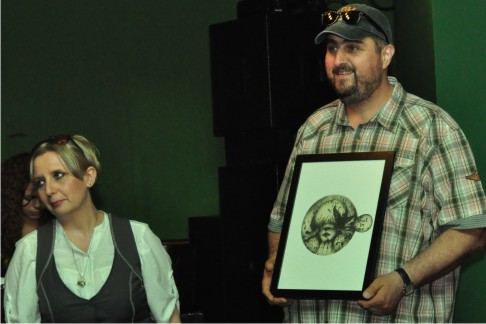 Sorana Grigoraș, desenatoarea coperții numărului 13, a premiat autorul unui antrenament de imaginație cu ilustrația înrămată oferită de Atelierul de print.