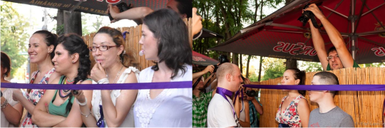 A urmat concursul de baloane de gumă. Oana și Adina au ținut bine o panglică lată mov și au depărtat-o în etape tot mai mult, până am obținut câștigătorul celei mai grasei mingi de plajă.