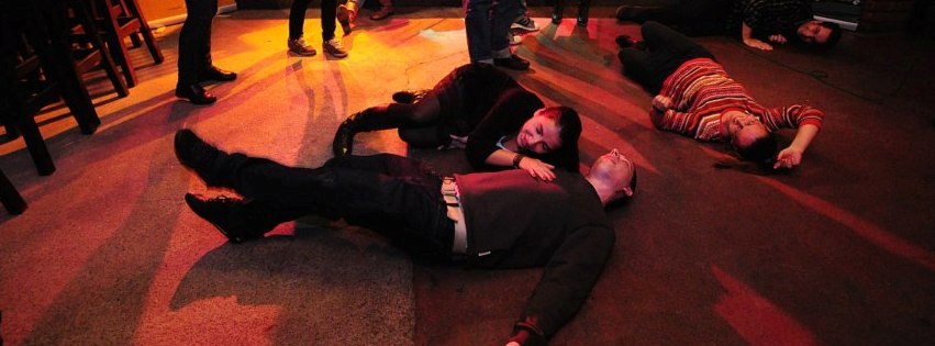 Am adăugat un ‘till you drop în descrierea evenimentului de pe Facebook ca să fie clar ce recomandă poza asta, făcută la lansarea numărului 8 al revistei, tot în Mojo, când provocarea a fost mimarea „unui leșin cât mai lent”. De data asta va fi vorba de dans.