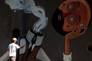 Terfelit și plin de vânătăi, cu vreo două coaste rupte și coada jumulită, demonul abia scăpă cu viață din picioarele trecătorilor. Vru să-și tragă sufletul, și, neavând de ce să se sprijine, se rezemă de zidul proaspăt pictat. Ca și cum l-ar fi recunoscut, murala îl trase din nou în stratul de vopsea, de care se lipi și mai strâns ca înainte. Scaraoțchi era prea obosit ca să se mai lupte. Se lăsă în voia sorții potrivnice, clipind stins din ochii pictați.